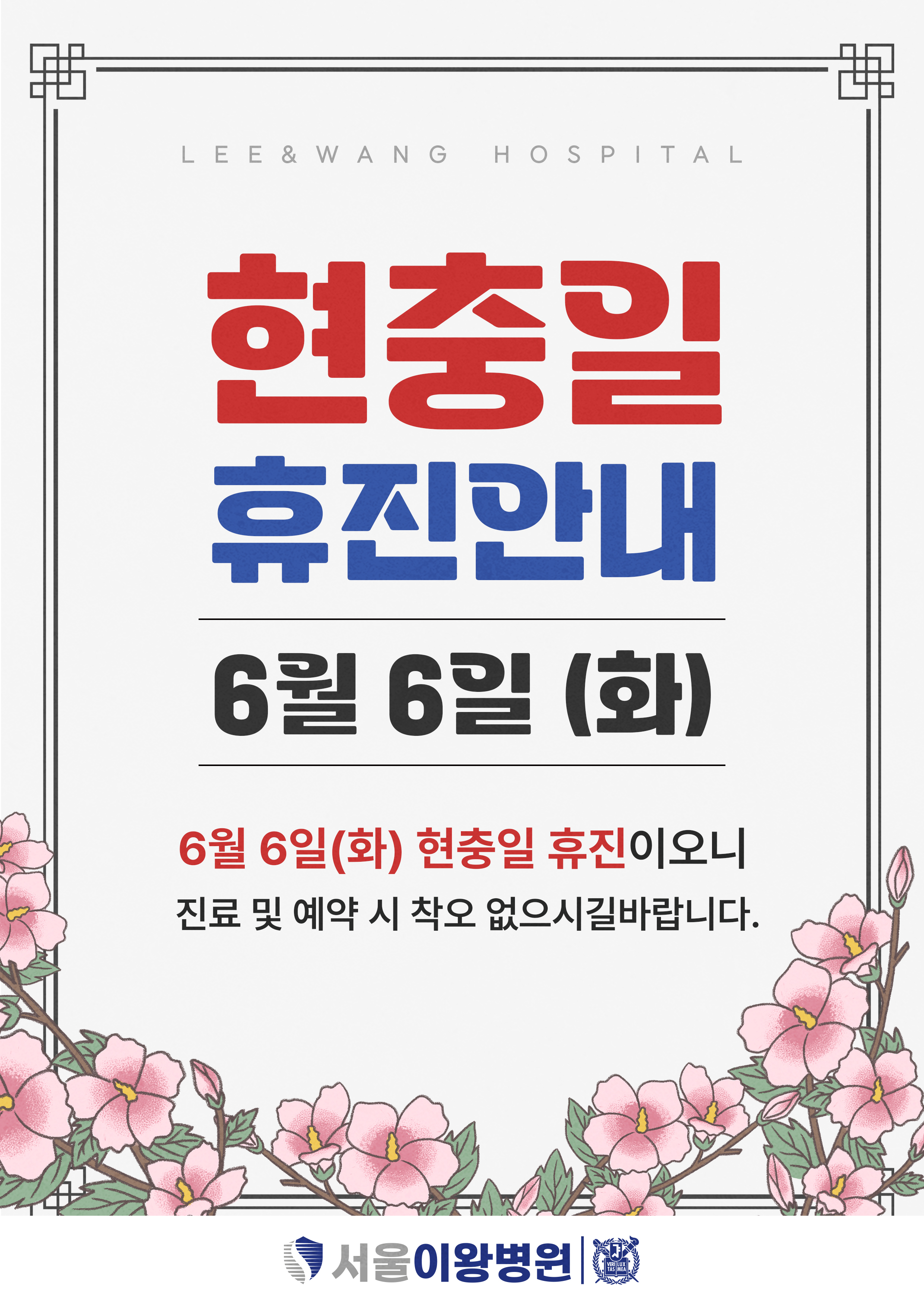 서울이왕병원은 6월 6일(화) 휴진입니다.