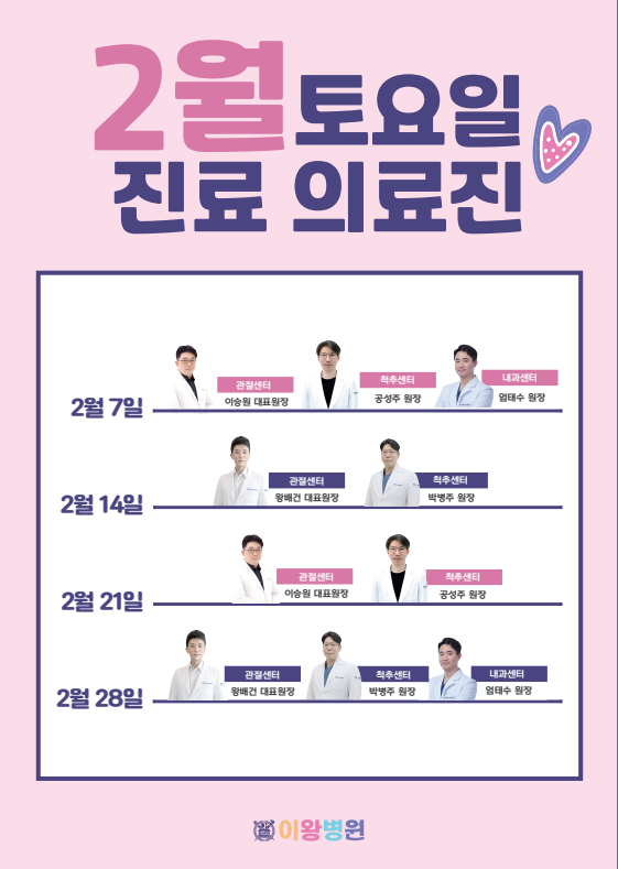 평일 내원이 어려운 분들을 위해 이왕병원은 2월에도 토요일 진료 및 수술을 정상 운영합니다.
